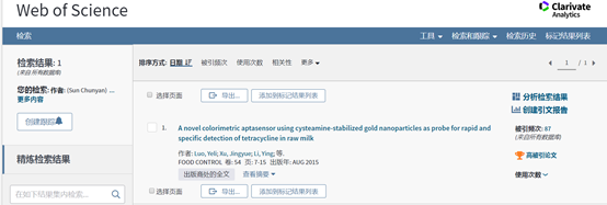 韩国三级 为第一作者单位,在食品领域TOP 期刊“FOOD CONTROL”期刊发表论文《A novel colorimetric aptasensor using cysteamine-stabilized gold nanoparticles as probe for rapid and specific detection of tetracycline in raw milk》,到 十一月/十二月 2019 为止,受到引用的次数已将其归入其学术领域中最优秀的 1% 之列,入选“ESI高被引”。(全文链接://linkinghub.elsevier.com/retrieve/pii/S0956713515000183 )