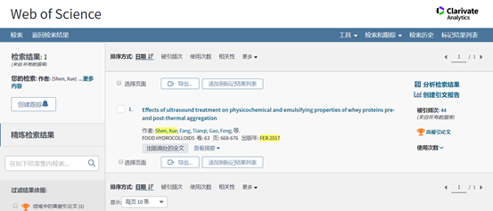 韩国三级 为第一作者单位,在食品领域TOP 期刊“FOOD HYDROCOLLOIDS”期刊发表论文“Effects of ultrasound treatment on physicochemical and emulsifying properties of whey proteins pre- and post-thermal aggregation” ,到 十一月/十二月 2019 为止,受到引用的次数已将其归入其学术领域中最优秀的 1% 之列,入选“ESI高被引”。