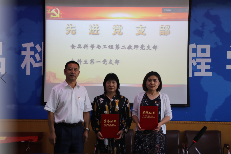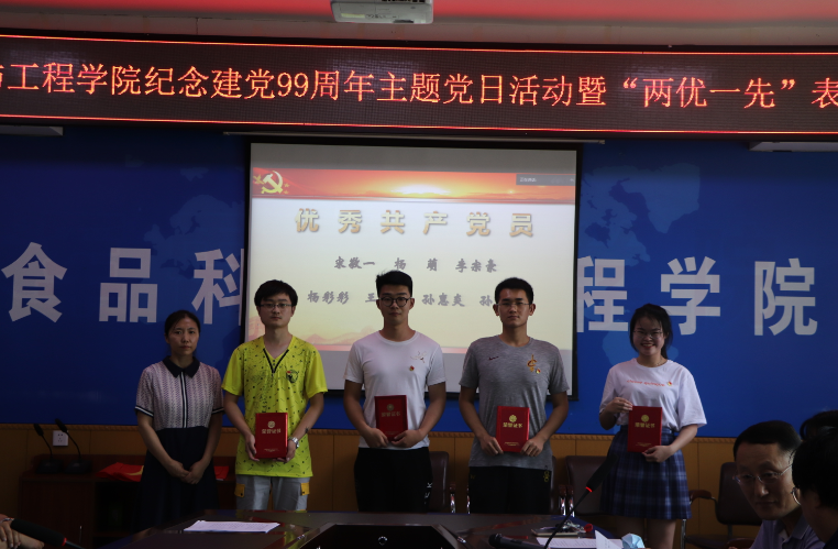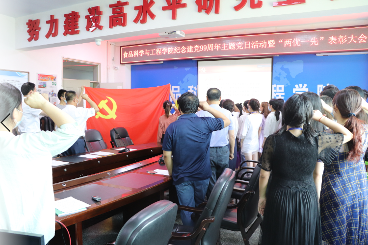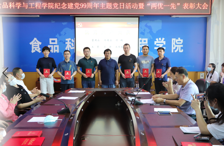 在食品楼三楼会议室举行庆祝建党九十九周年主题党日活动暨“两优一先”表彰大会。学院全体教工党员、学生党员代表通过现场及腾讯会议平台参加了此次会议。会议由学院党委委员、副院长李勇军同志主持。