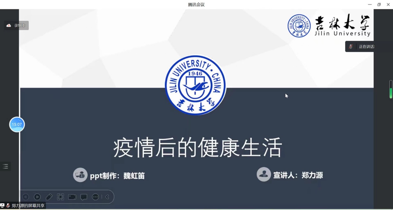 会上,主讲人主要讲解了学生群体如何在特殊时期持续学习的同时保障身体健康,并分四个方面给大家做了介绍。第一,由阳转阴后容易感到疲惫,导致免疫力下降,再加上各种病毒出没,都使同学们的身体健康更容易遭受到袭击。第二,面对这些情况我们必须主动出击,不仅要注意饮食、加强锻炼、保持心理健康,还要注意个人卫生,遵从医护人员的叮嘱。第三,食补是最好的疗养,我们要根据膳食指南合理搭配自己的饮食。第四,面对病毒,要以科学理智的态度对待心理问题,保持心理健康。最后,郑力源同学表示希望大家能不惧病毒,在科研学习的过程中也要保持好身心健康。