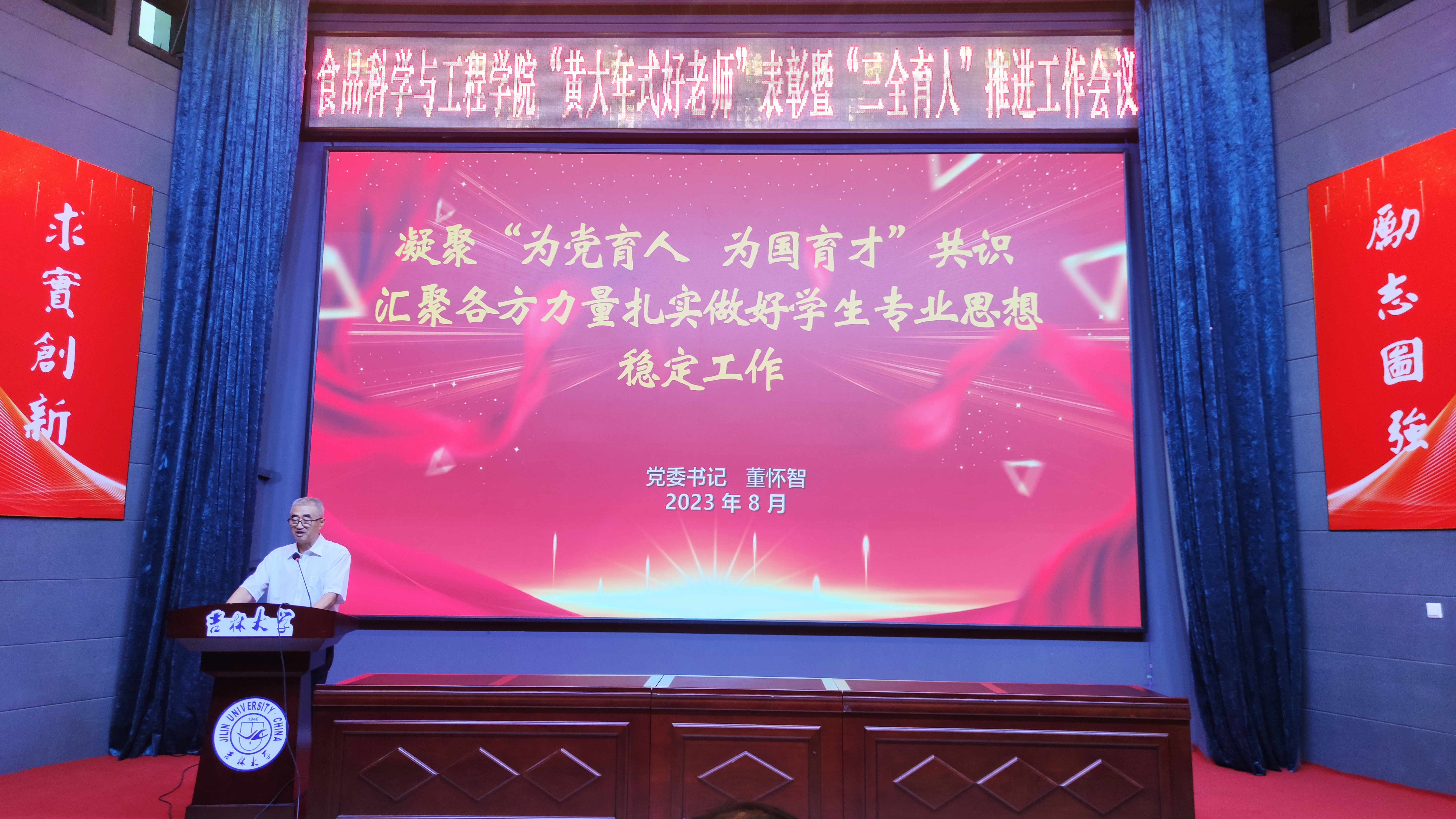 最后,学院党委书记董怀智以题为《凝聚“为党育人 为国育才”共识,汇聚各方力量扎实做好学生专业思想稳定工作》进行了总结讲话。董怀智书记代表学院党委向获得荣誉称号的教师表示热烈的祝贺并致以衷心的感谢。并围绕“树信心、稳思想、育新人”三个方面同与会的老师和同志们探讨进一步推进“三全育人”以稳定我们学生专业思想的具体举措。一是夯实学科建设筑牢“三全育人”基础,树立学生专业自信心;二是凝聚各方力量强化“三全育人”,稳定学生专业思想;三是深化“引领工程”落实,加强育人队伍建设强化“三全育人”合力。号召学院教职工秉持和弘扬学院“为人、为学、为师、为国”的育人理念,坚持“立德树人”根本任务,扎扎实实的将全员、全过程、全方位育人工作不断推向深入,