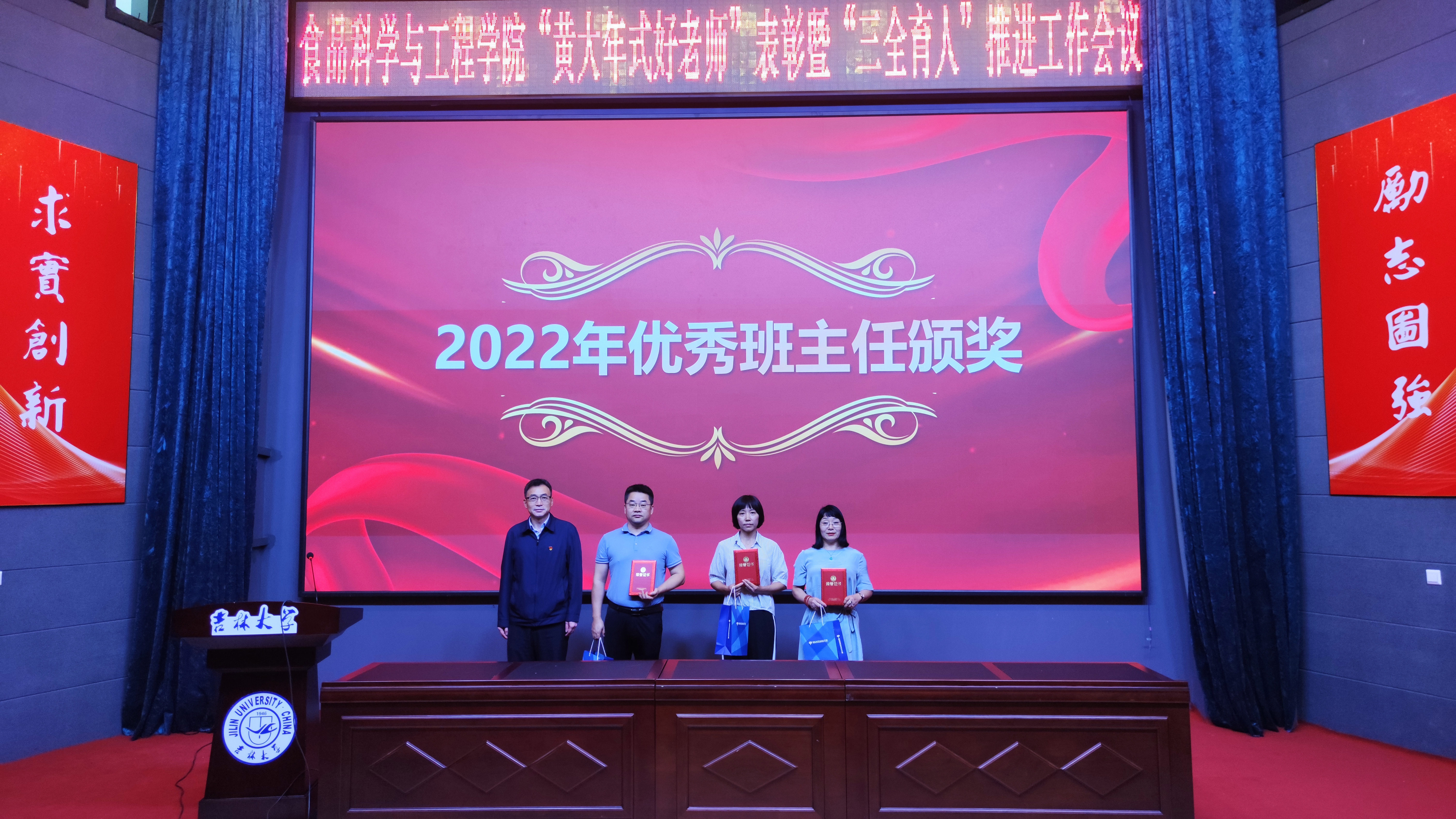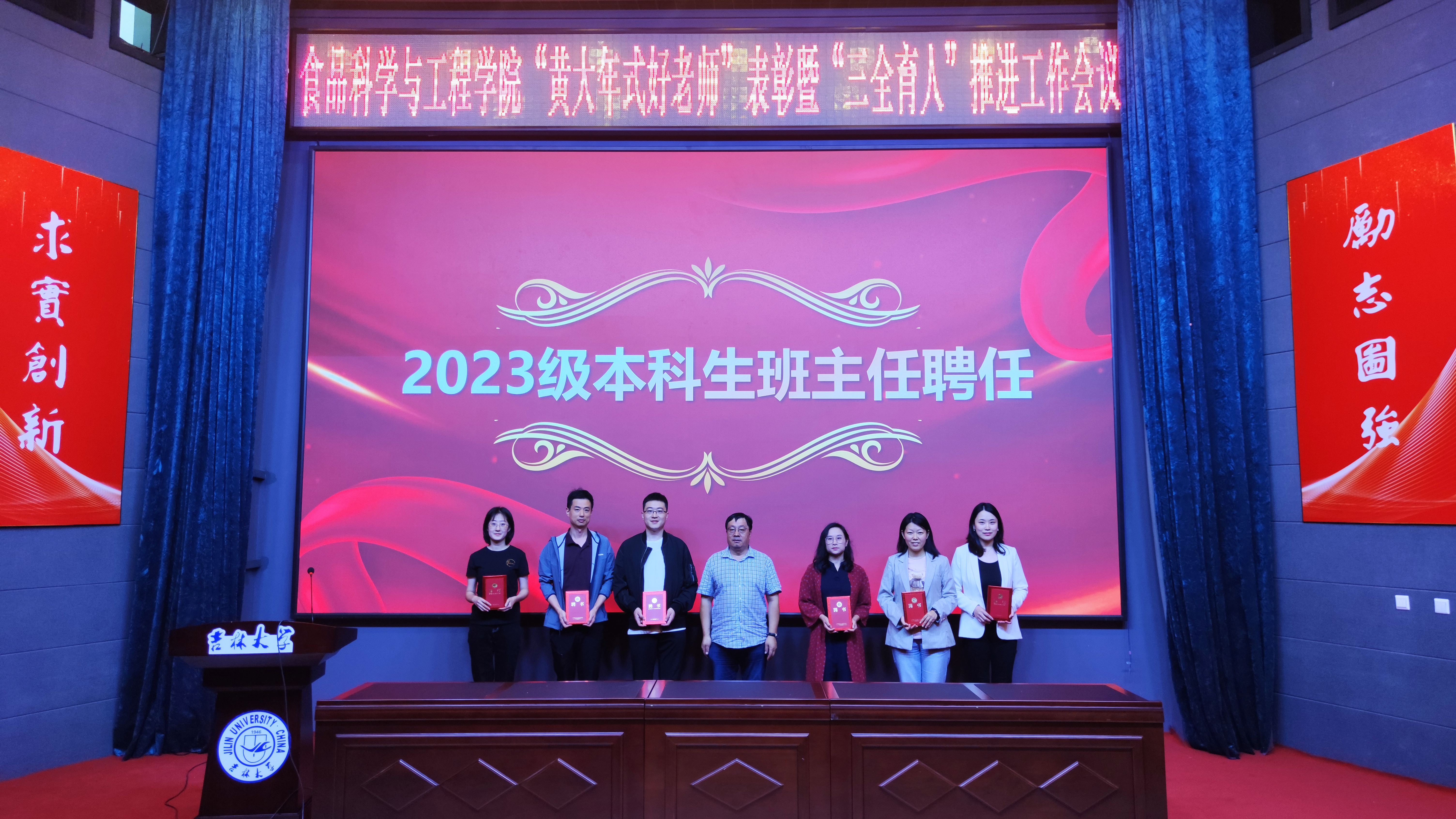 随后,副院长孙春燕传达了《高等学校课程思政建设指导纲要》主要精神,并为教师代表颁发了《食品科学与工程类课程思政案例指南》书籍;党委副书记李超宣读了《2022年优秀班主任获奖名单及2023 级新生班主任聘任名单》;副院长陈玉江为荣获优秀班主任荣誉的李欣欣、董周永、卢静等3位老师颁发了证书及纪念品,副院长周亚军为2023 级新生班主任颁发了聘书。
