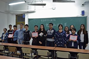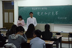 学生党支部于2016年9月23日在科学讲堂408举行了党史知识竞赛活动。 此次竞赛分为两个阶段举行,分别为选择题环节和简答题环节;学院本科生党员分为6组参加竞赛。第一阶段,每组一名选手轮流上台,在主持人出题后,六组同时答题,半分钟内把答案写在答题板上,亮答题板,正确即继续答题错误则换人继续答题。第二阶段,共五道题,组内四名成员讨论答题,两轮比赛合计答对题数多的队伍获胜。同学们在答题期间积极思考、谨慎回答。现场观众也始终保持安静,为选手们创造了最佳的答题环境。最后,2014级食科1班党员队伍和食科2班党员队伍拔得头筹。 本次党史竞赛受到学院党委的高度重视,学院党委书记高福和同志在赛前亲自审定了竞赛赛题,并要求全体学生党员人人参与,认真准备。竞赛促进了学生党员对党史知识的了解,对合格党员的培养起到了积极作用。
