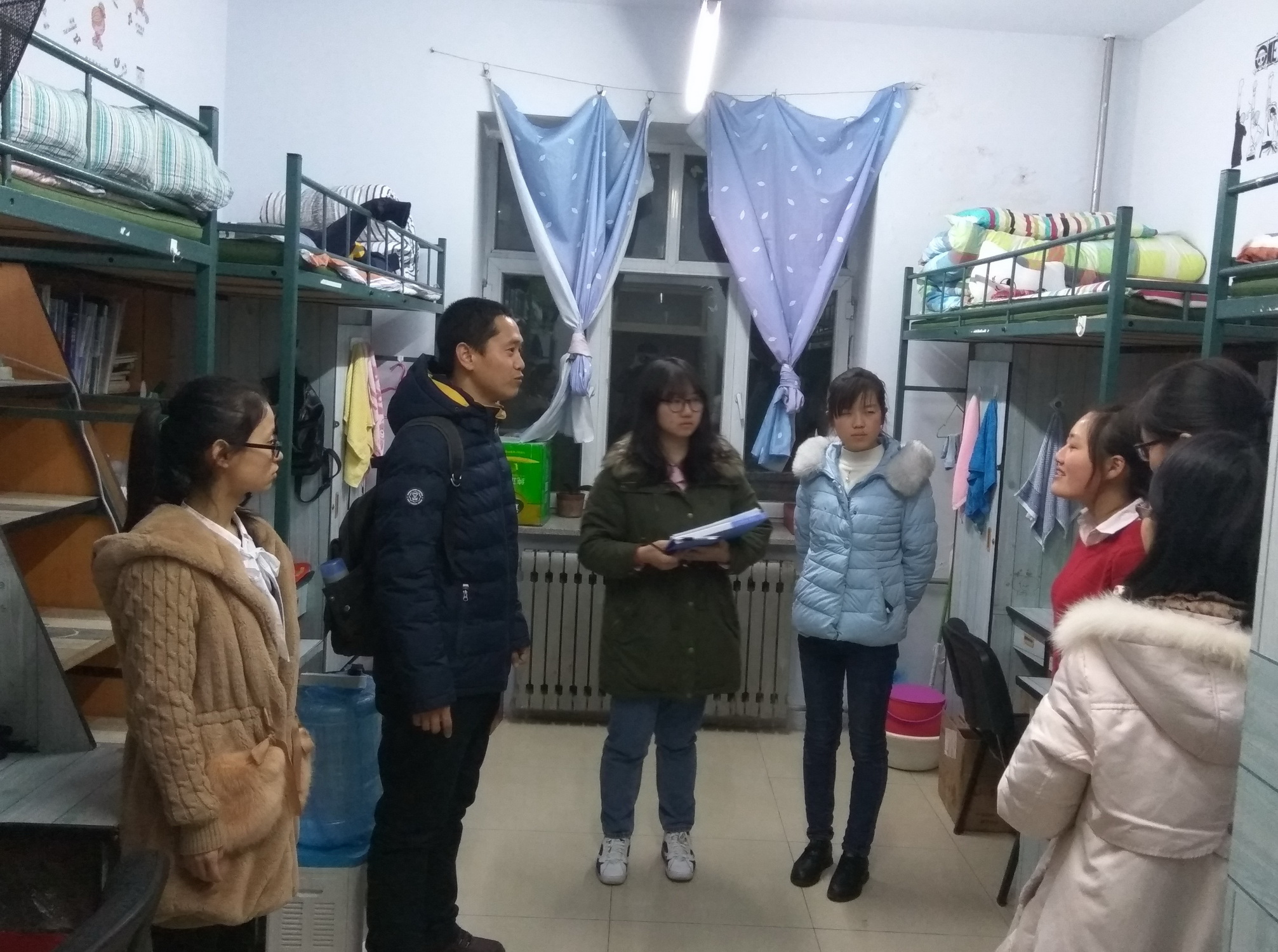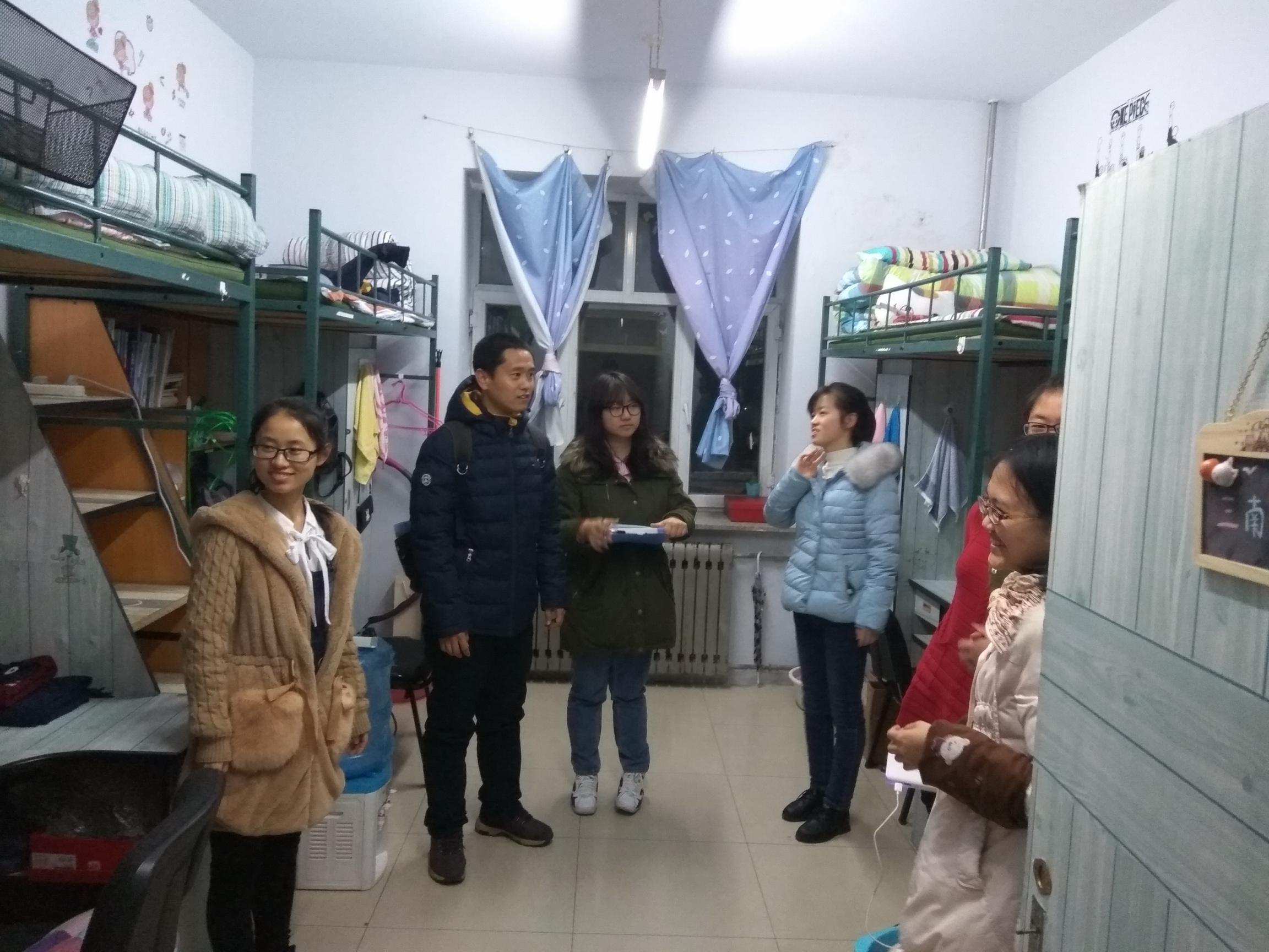 2016级兼职辅导员侯聚敏老师带领学院学生会纪检部成员对大一年级开展了查寝工作。 查寝期间,侯老师详细地询问了同学们近来的学习及生活状态,并重点检查了寝室的卫生情况,使同学们感受到了老师的关怀。同学们的寝室环境大多干净整洁,井然有序,侯老师对环境良好的优秀寝室提出了表扬,对卫生存在问题的寝室进行了指正。侯老师不仅对每个寝室的卫生状况给出相应的评价,还为同学们建设良好的寝室环境提出了宝贵的建议。查寝结束后,我部将查寝的相关记录整理存档,并对本次查寝活动进行总结。 通过此次检查,不仅加强了宿舍安全管理,也提高了同学们的积极性,进一步营造了安全、健康、和谐的学习生活氛围。希望通过我们的工作,同学们能自觉保持室内卫生,让寝室生活更加安全、卫生、美好!