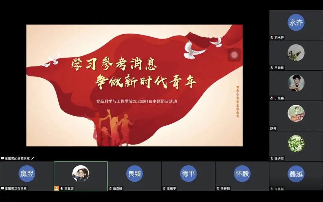 2020级食科第二团支部通过腾讯会议开展“学习《参考消息》,争做新时代青年”主题团日活动。2020级食科二班全体团员参加,本次活动由团支书组织开展。通过这次此次团日活动学习,同学们的思想政治觉悟得到了进一步的提高。