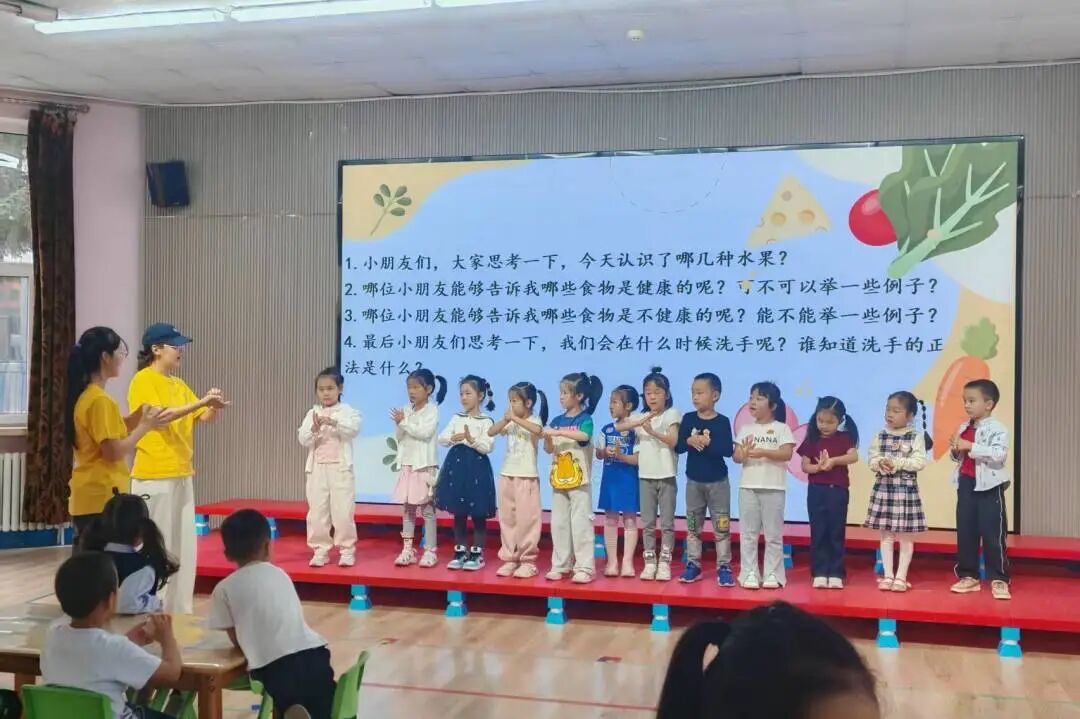“水果蔬菜对对碰” 游戏接续进行,儿童牢记 “见水果拍手、见蔬菜跺脚” 规则,依指令专注互动,在沉浸于欢乐氛围的同时,丰富了果蔬相关知识。