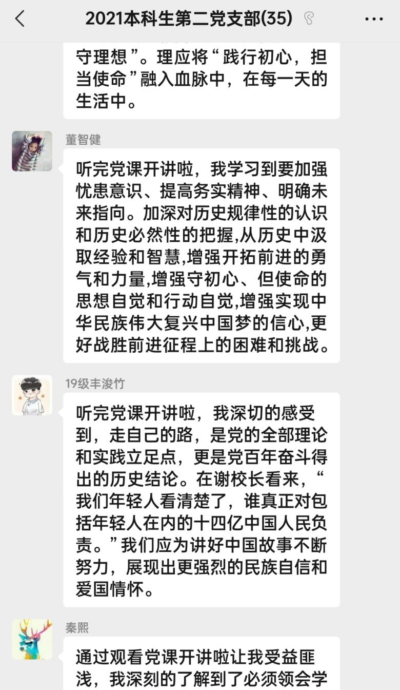 视频观看完毕后,与会同志进行交流讨论。支部党员周洪江表示,不明史,不知过往,今后将牢记党的宗旨,提高党性修养,以实际行动,真正发挥学生党员的先锋模范作用,增强身为党员的使命感和责任感。预备党员夏婉婷同志,谢老师掷地有声的那句话,“一百年来,我们党回答了很多问题,为中国人民谋幸福、为中华民族谋复兴,从来没变过!”让她印象深刻,中国共产党始终同人民想在一起、干在一起,风雨同舟、同甘共苦,为实现人民对美好生活的向往不懈努力。方帅贞同志总结道,通过本次党课学习后,希望大家不忘自己的入党初心,坚定理想信念,肩负起新时代青年使命与责任,以更昂扬的精神状态投入到工作中去不负时代,不负韶华在会后大家还在支部的微信群进行了热烈的讨论,交流本次党课学习的感想。