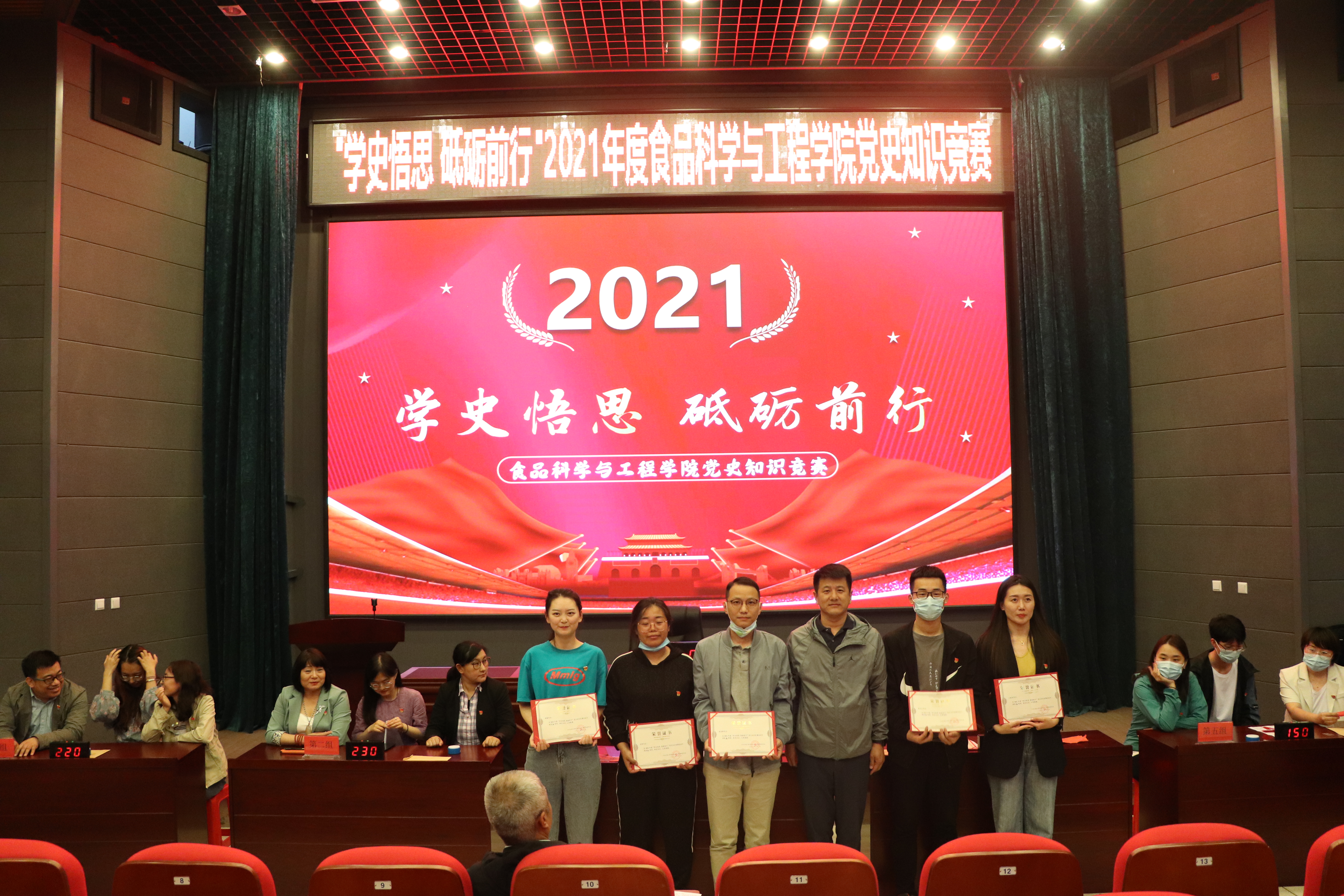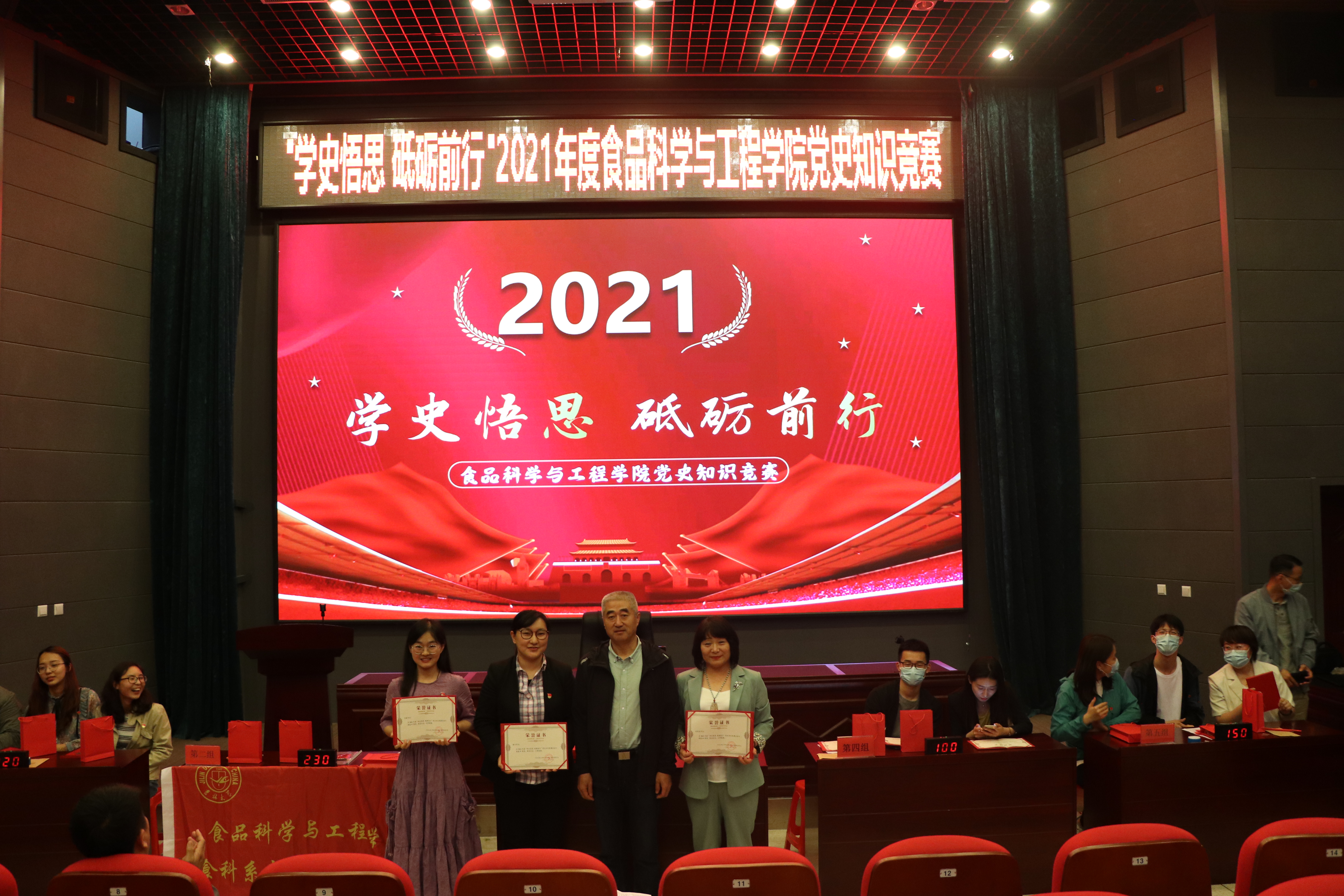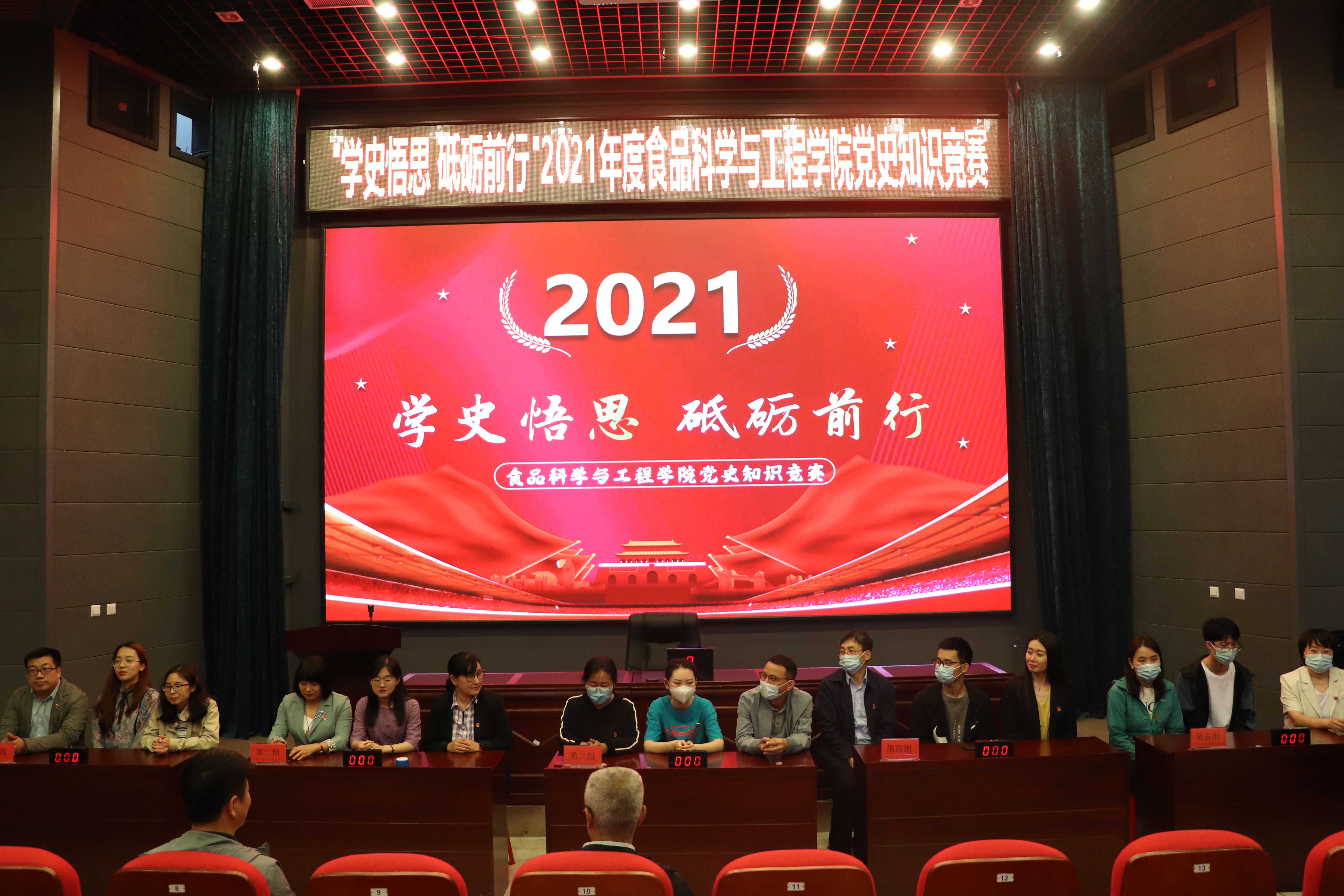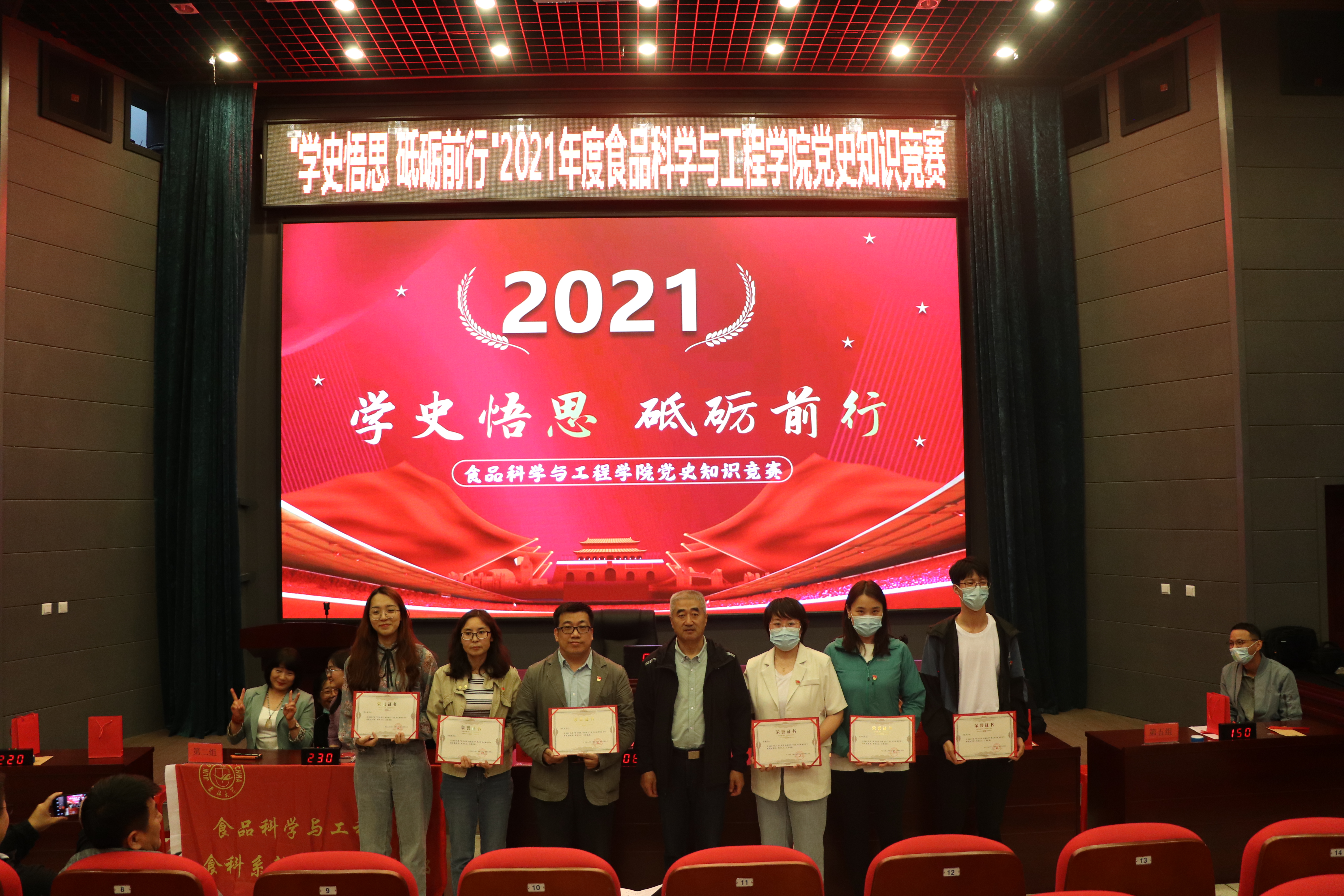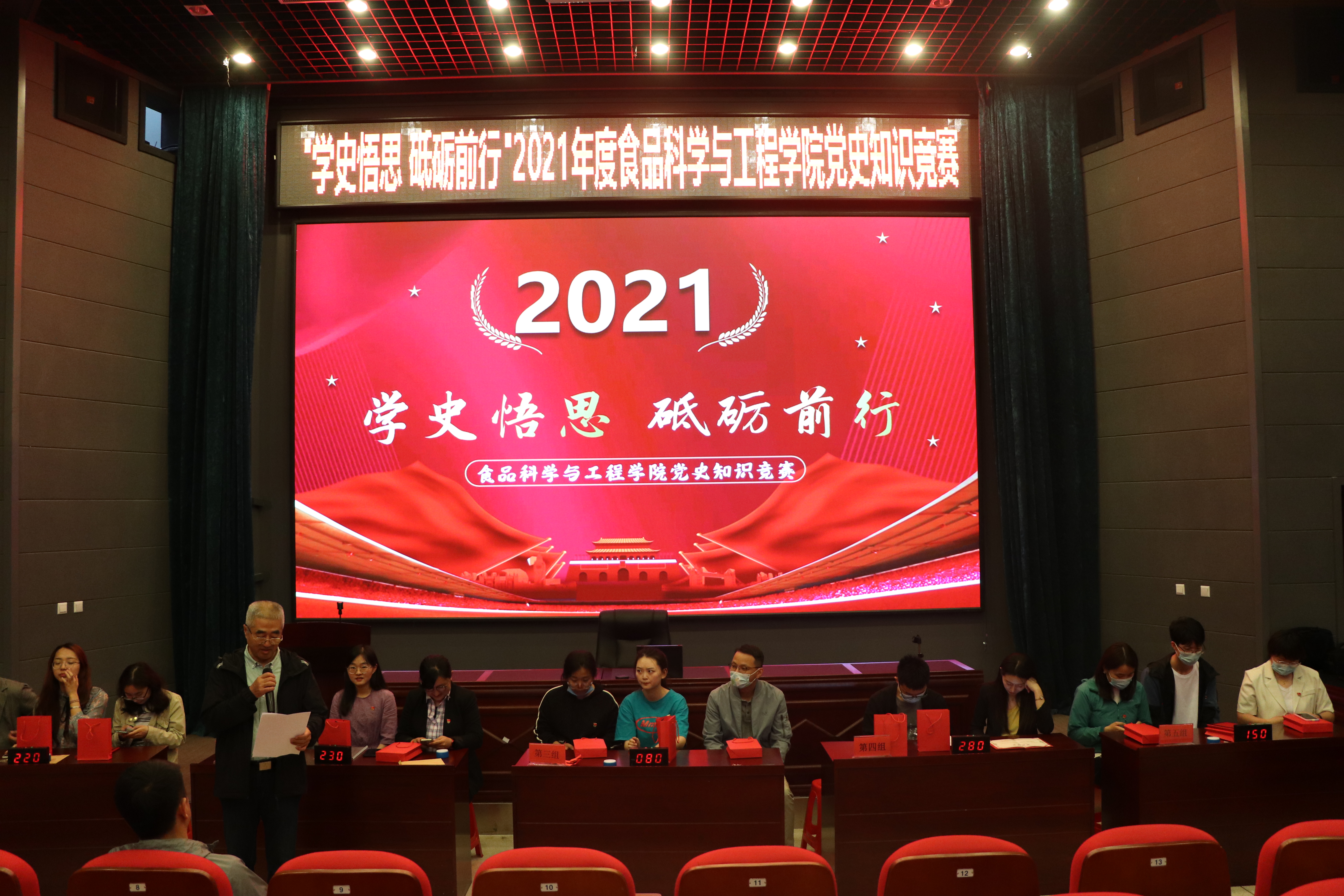 本次“学史悟思 砥砺前行”党史知识竞赛由学院师生党员联合组成五支代表队参赛,知识竞赛有必答题、抢答题、风险题等环节,涵盖《中国共产党章程》《党的十九大报告》、党建知识应知应会100题等党史相关内容。主持人宣布竞赛开始后,全体师生党员齐唱《中华人民共和国国歌》,比赛帷幕就此拉开。比赛中,选手们精神饱满,积极踊跃,沉着应答,展现出丰富的党史知识储备。在抢答题环节,各参赛队选手争分夺秒,精彩迭出,赢得了一阵阵热烈的掌声。比赛现场气氛热烈、紧张有序、扣人心弦,经过激烈角逐,食品科学与工程系第二教师党支部代表队荣获一等奖,食品科学与工程系第一教师党支部和实验教学中心党支部代表队荣获二等奖,食品质量与安全系教师党支部和机关党支部代表队荣获三等奖。
